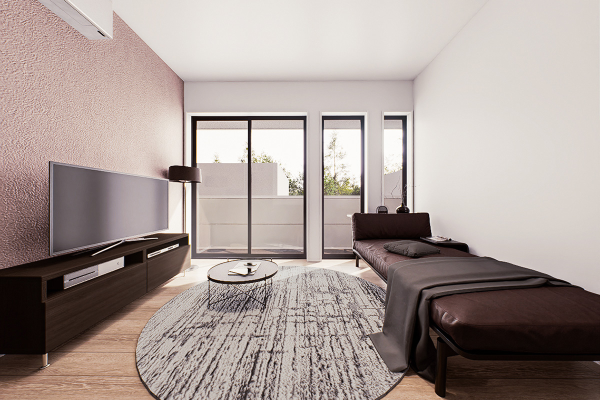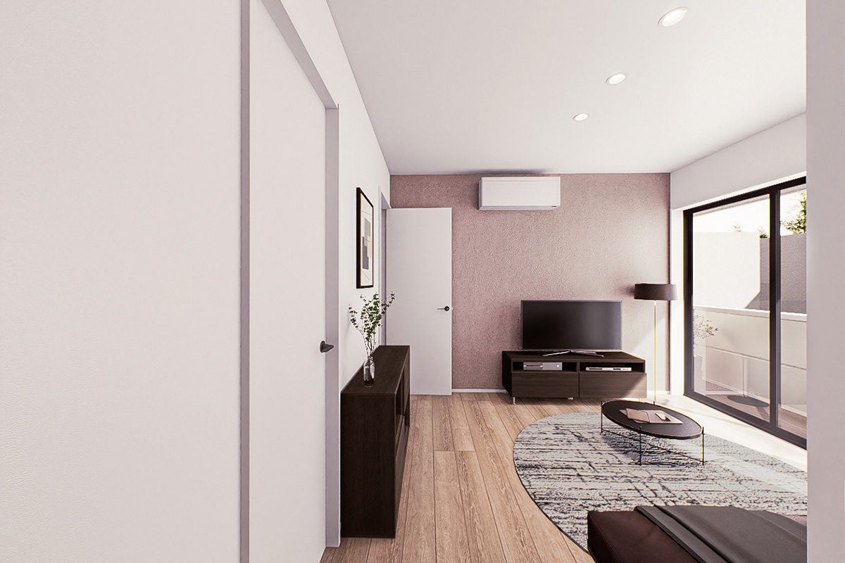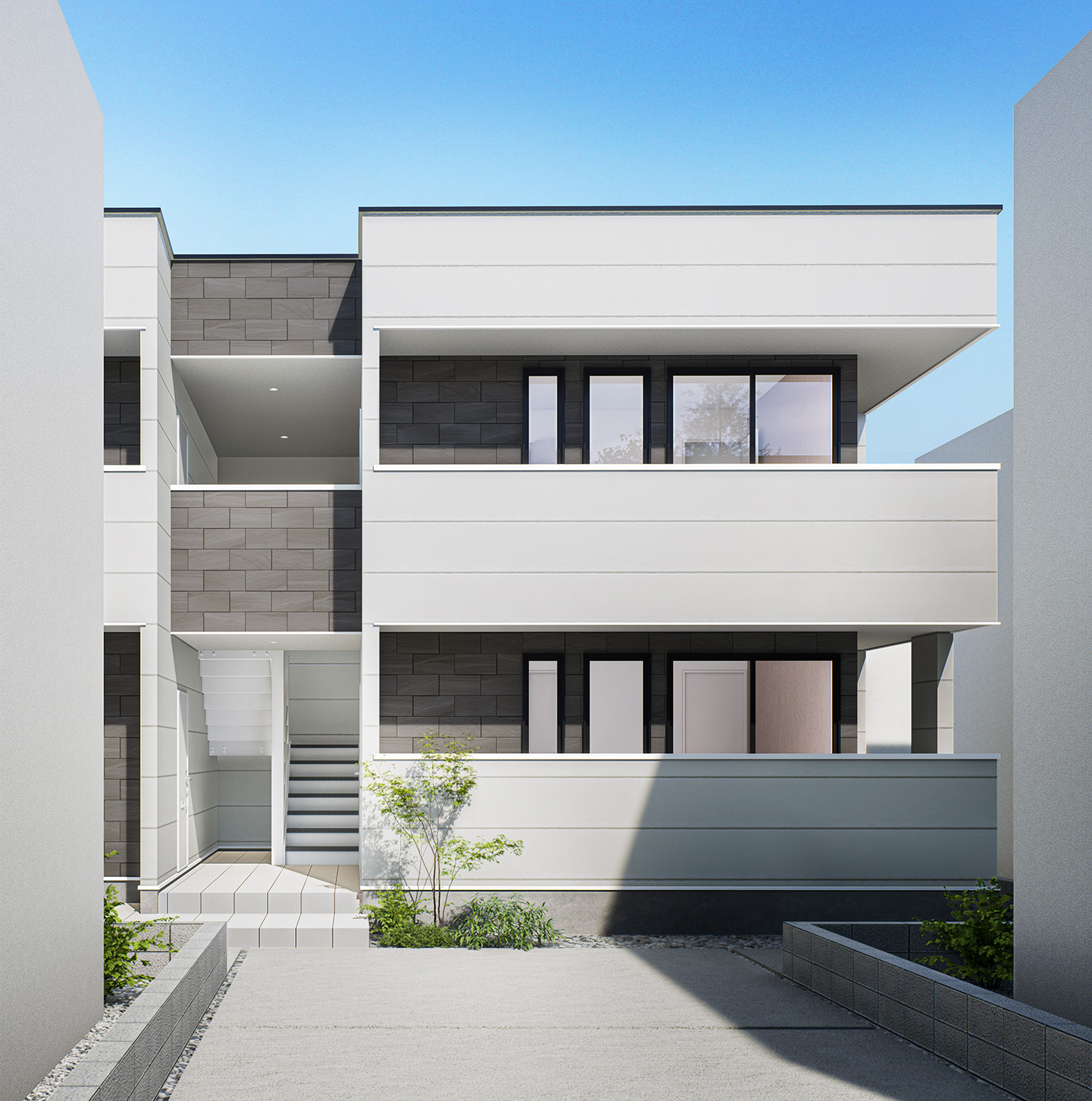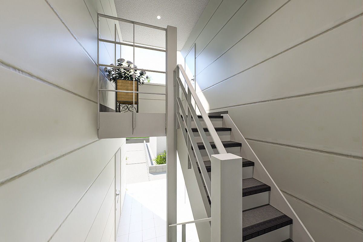 都市部の住宅密集地におけるコンパクトな旗竿地に佇む2階建て共同住宅。路地の隙間から、一部だけのぞくファサードにも光るデザインを。ピュアホワイトの明るい外壁材を採用することで、陰になりやすい奥まった場所でも明るい印象を創出しています。凹凸をつけながら、グレージュの石目調タイルをあわせることで、彫りの深い表情へ。また、大きな面積をサッシとすることで、抜け感を生み出しています。