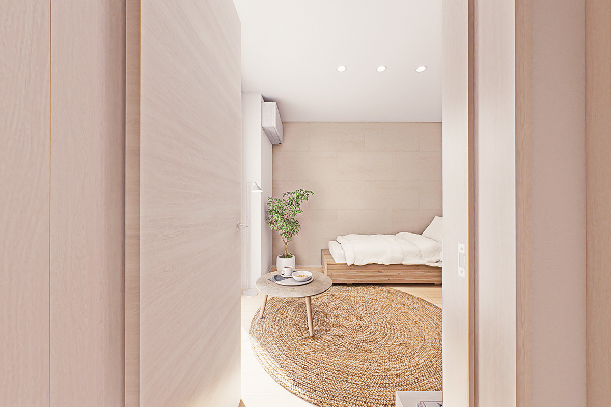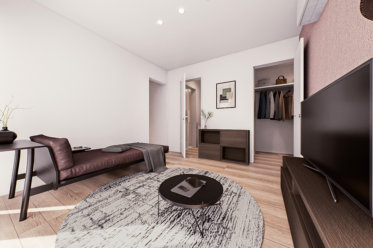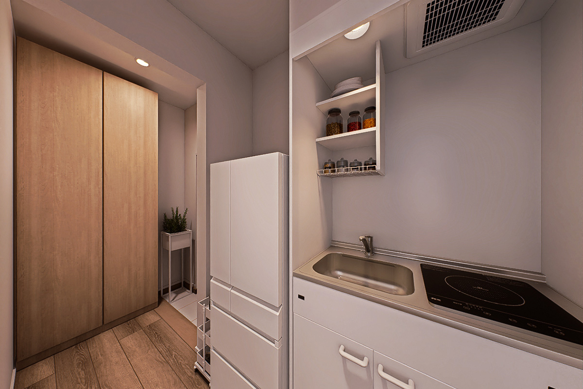 コンパクトな住まいほど境界がなくなりがちな、居住空間と水回りを完全分離。集中もリラックスもしやすい環境をつくりだします。水回りはシンプルな家事動線を意識した配置としました。2タイプの間取りのうち、一方は「キッチンと洗濯」を近くに。もう一方は「洗濯と収納」を近くに。暮らしやすさを意識したプランとなっています。