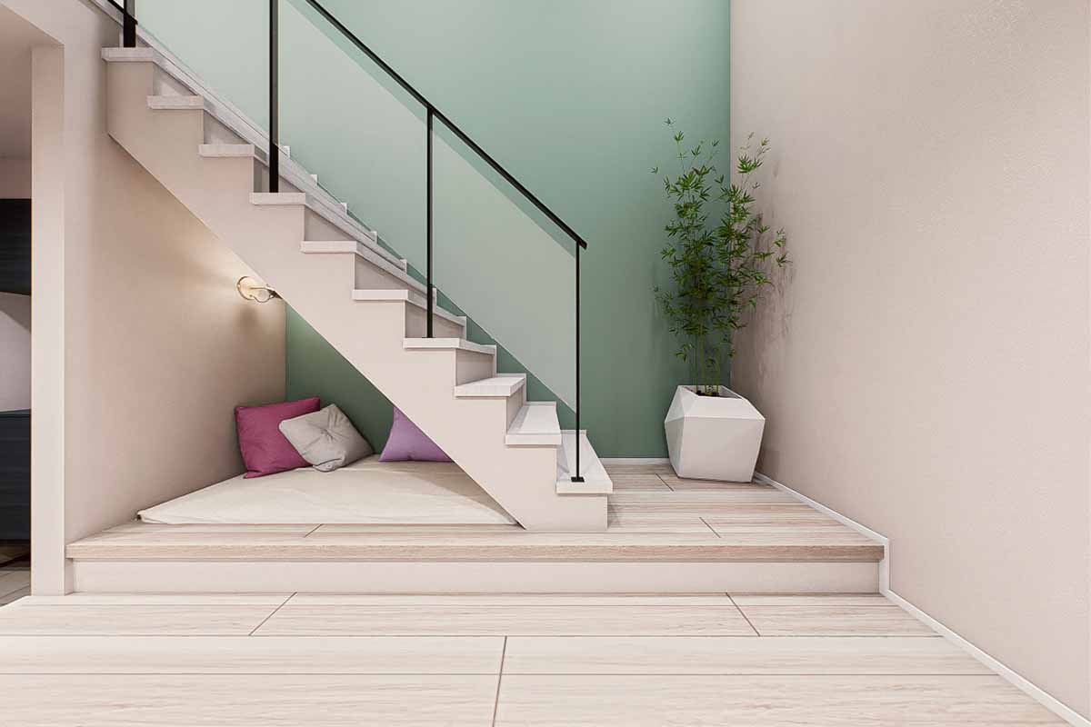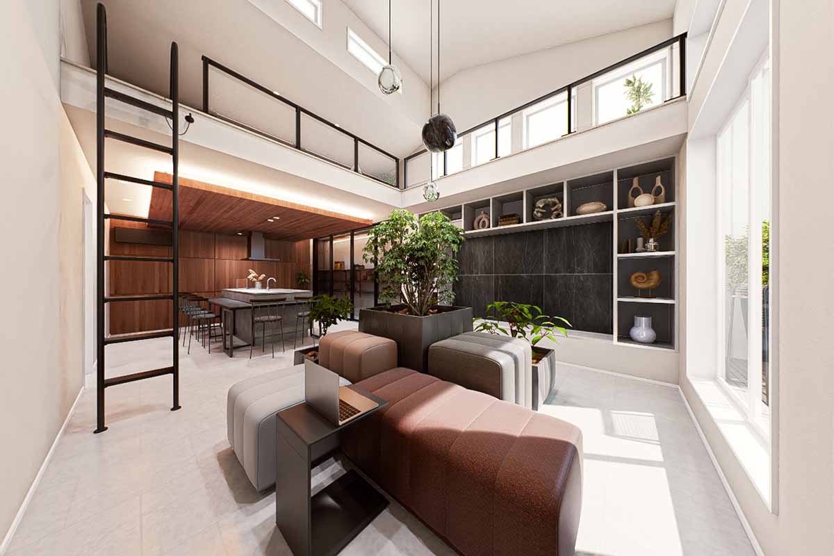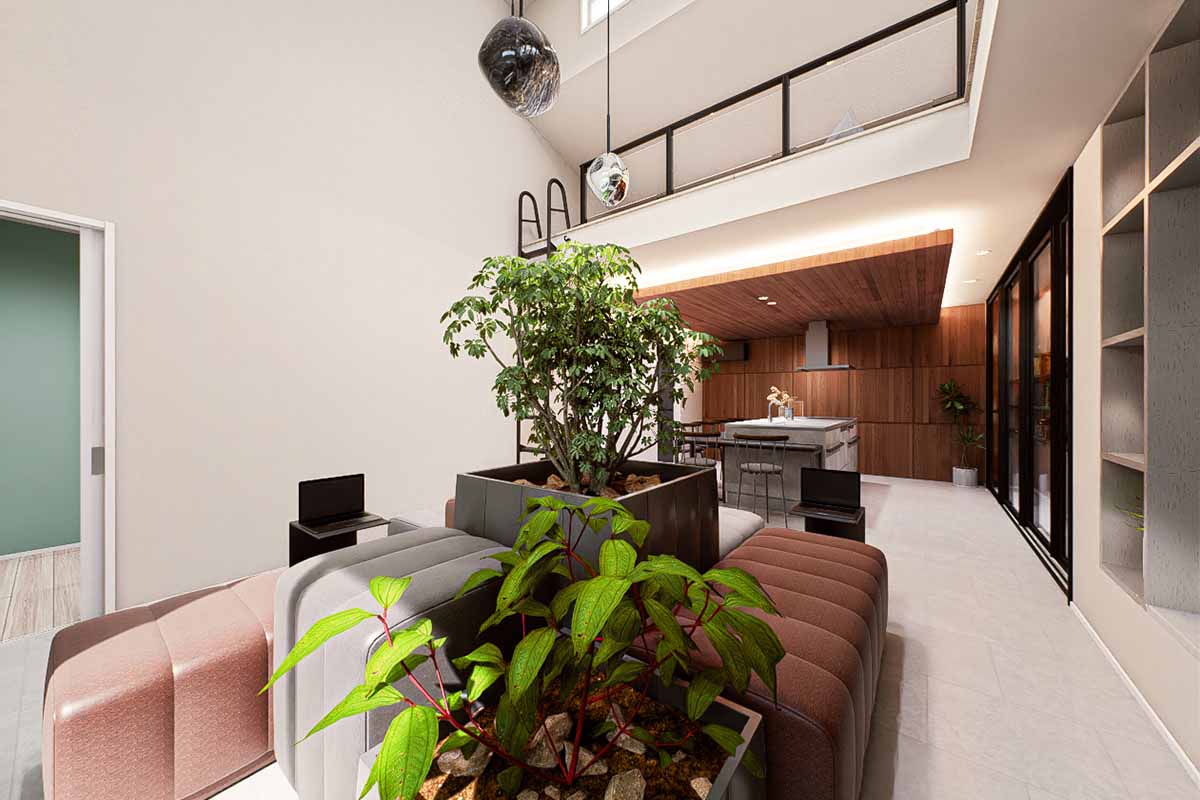 ロフトと吹き抜けを両立させることで、通風・採光に優れた開放的なLDKに。バルコニーの庇を深めに設計し、夏の日差しは反射光でやわらかく室内へ。冬は暖かい太陽光がたっぷりと入る、快適な空間です。