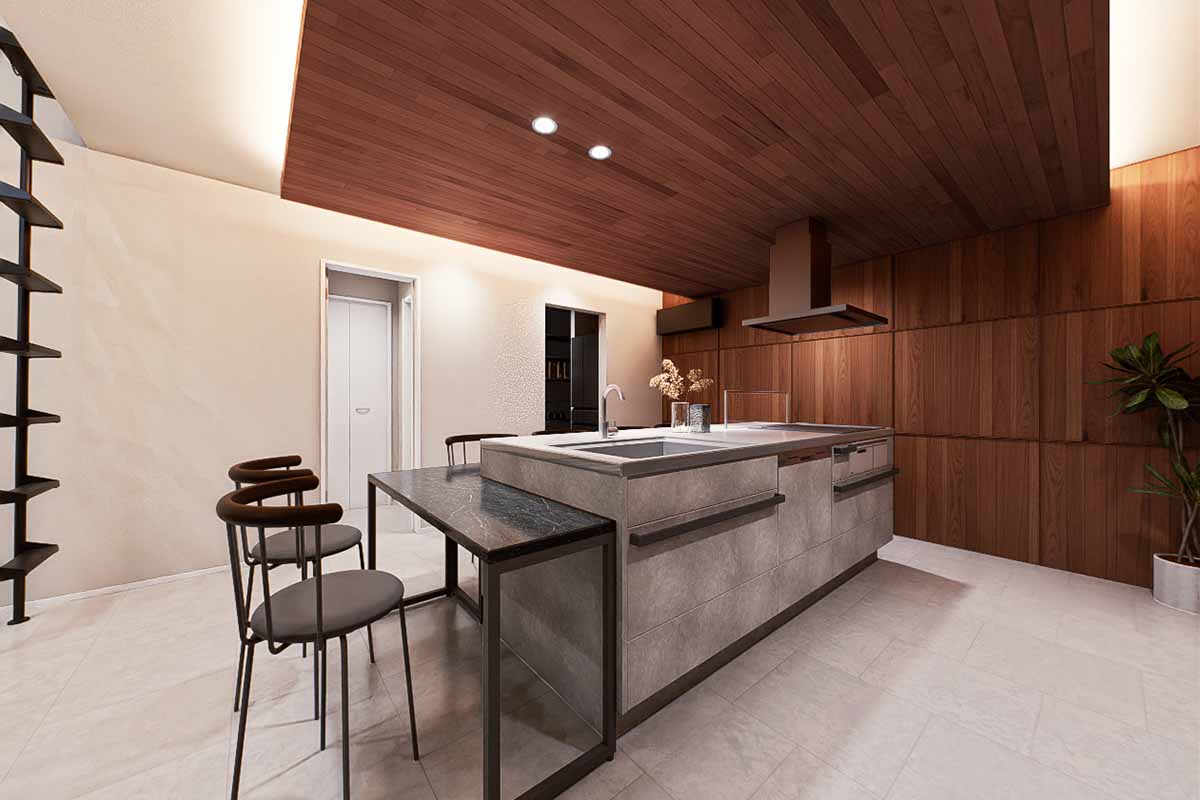 家中どこからでもアクセスできるキッチンは、調理も配膳も効率的。家族で並んで料理をしたり、そのまま食卓として囲んだり。木目の天井や壁が、ぬくもりのある時間を演出します。