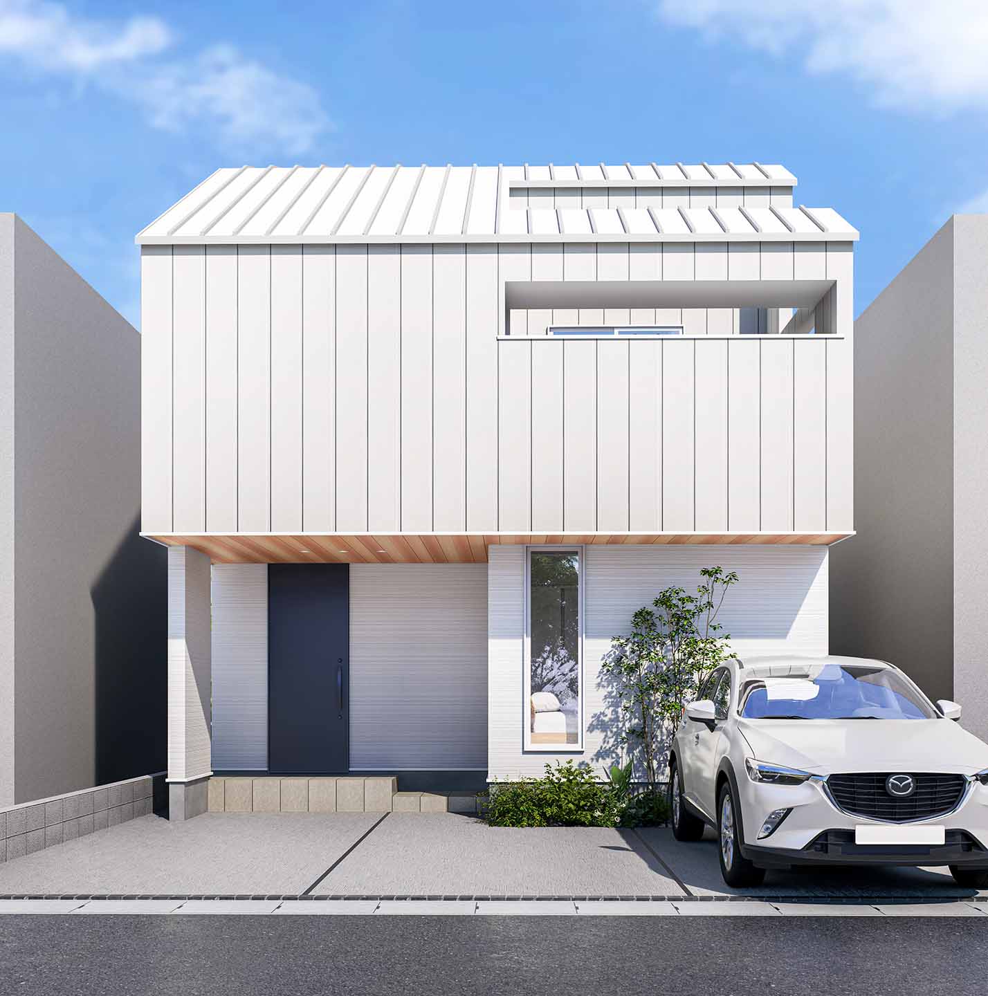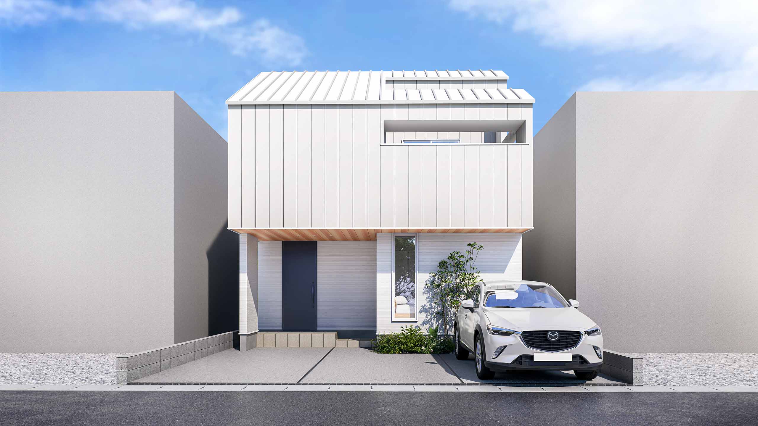 太陽光パネルを搭載しながら、屋根の傾斜で外観に配慮した省エネ住宅。屋根と外壁の素材感を揃えたスマートなデザインと、光と風が通り抜ける開放的な間取りが、普段の生活に心地よさをもたらします。