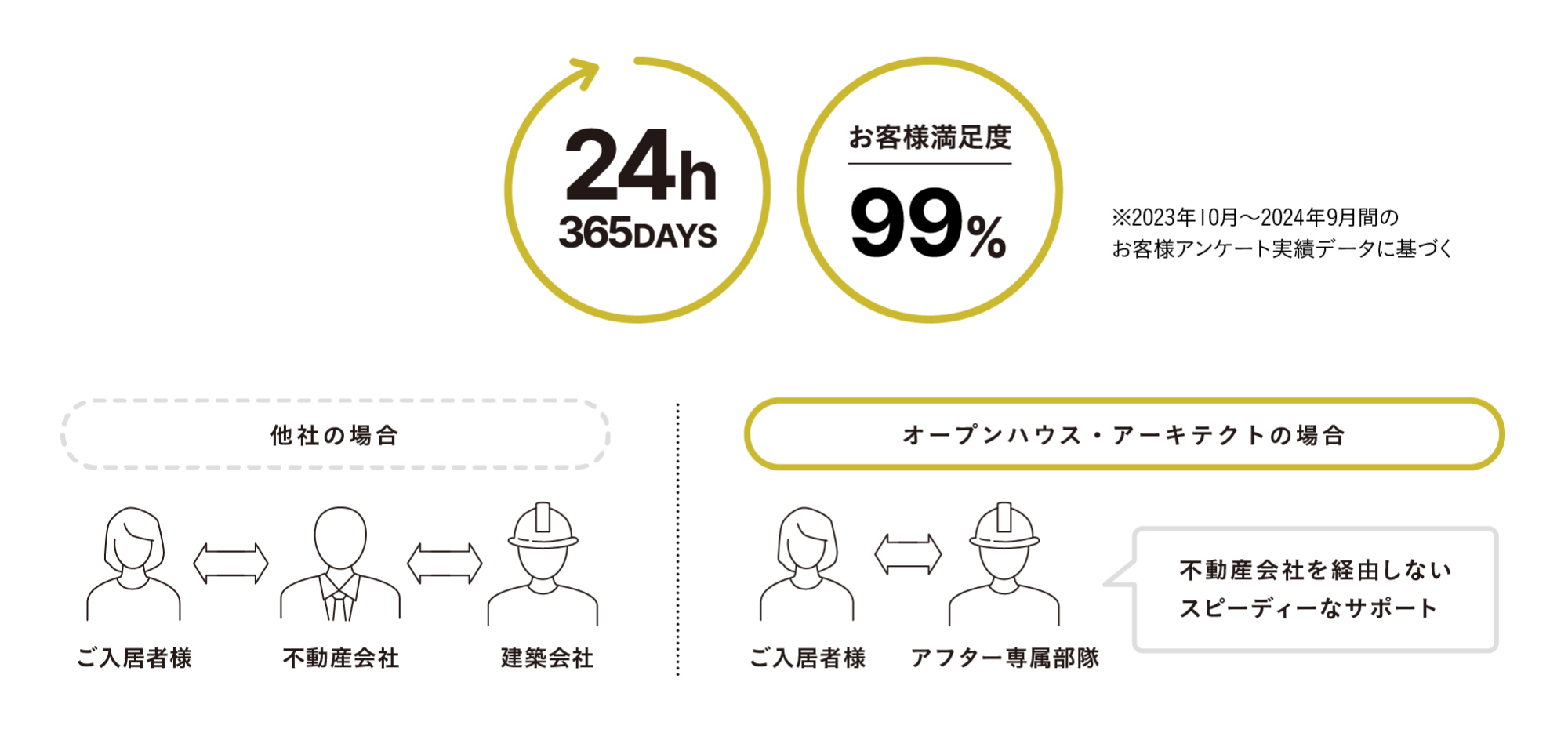 建築のベテランを含む専属部隊によるアフターサービスを提供しています。受付窓口は、24時間365日対応で、入居後のトラブルにも迅速に対応、20年長期保証プランや、リフォームのサポートなど、様々な入居者向けサービスも展開しています。