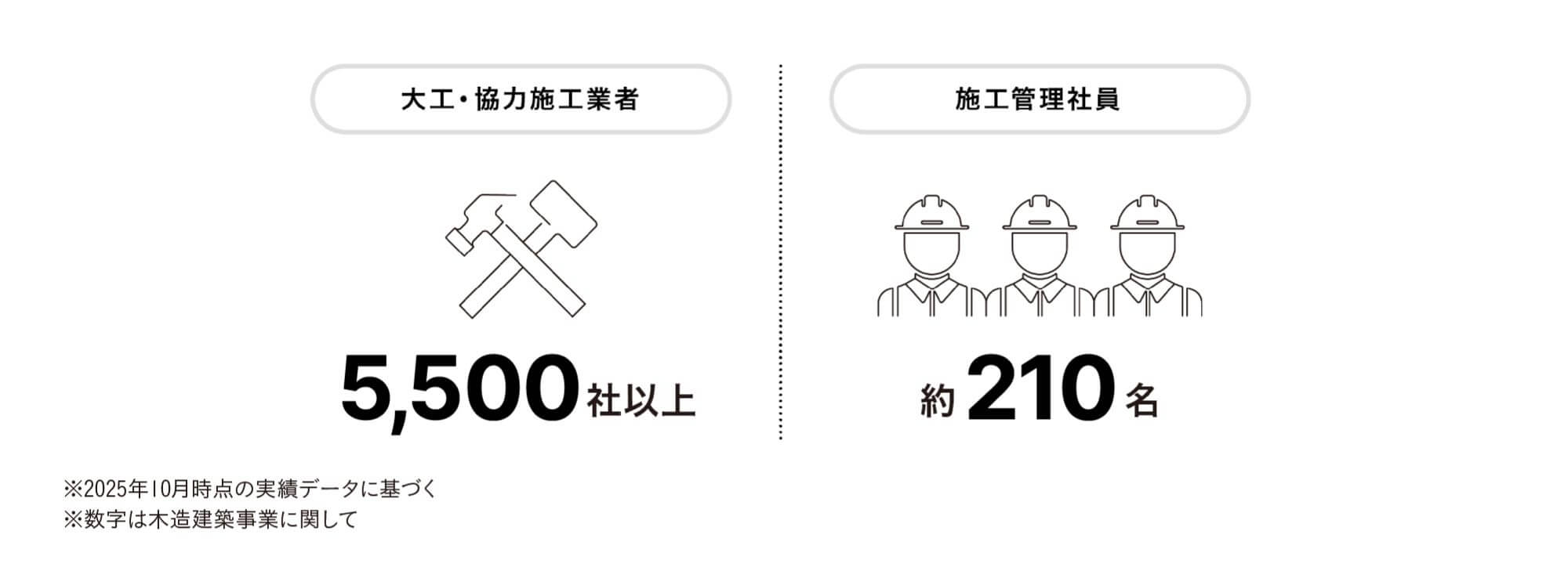 オープンハウス・アーキテクトは、中間業者を挟まずに5,500社を超える大工・協力施工業者と直接パートナーシップを結んでいます。また、約210名の社内施工管理体制で、高い機動力と短工期を実現しています。