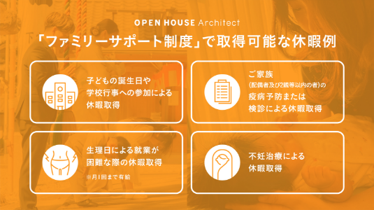 子どもの誕生日や学校行事への参加、家族の疫病予防・検診、不妊治療などのライフイベントに応じ、休暇の申請が可能です。特に生理日に関しては月1回に限り、就業が困難な際の休暇を有給で付与します。