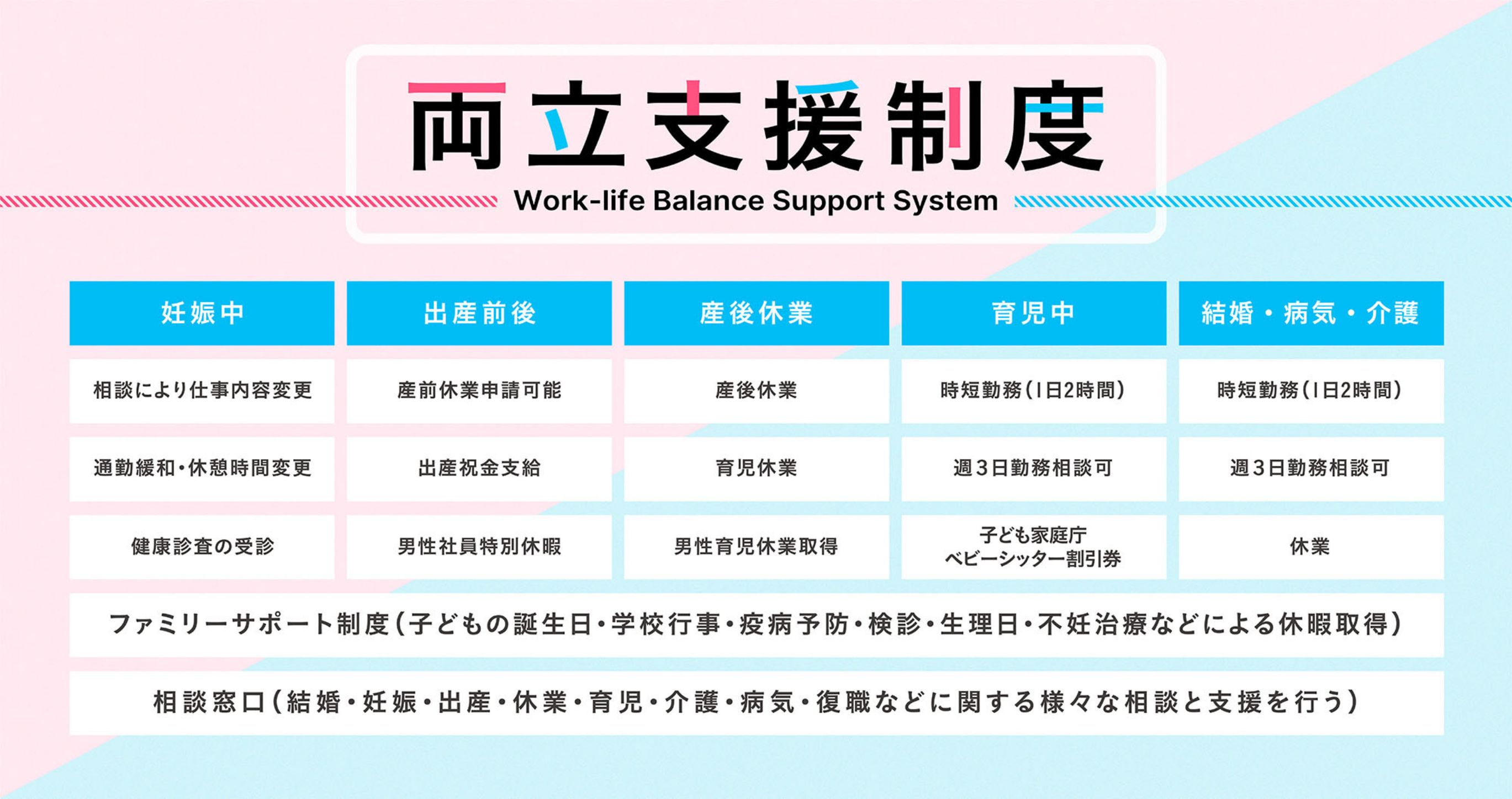 産前産後・育児休暇、時短勤務、週3日以上勤務、認可外保育園の差額補助(条件あり)、内閣府ベビーシッター割引券など、仕事と育児の両立支援制度があります。